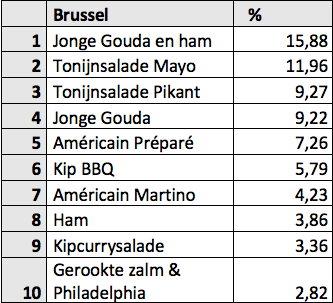 Maar eerst de ranking. Hét populairste broodje is het broodje met jonge Gouda, dat de voorkeur wegdraagt van 16,93% van de consumenten. Opvallend is dat het broodje op nummer één staat in Vlaanderen, maar dat in Wallonië het broodje met jonge Gouda en ham de rangen aanvoert. Ham en kaas eindigt daardoor als tweede favoriet voor de drie regio’s samen (15,39%). Maar er zijn nog meer regionale verschillen, zoals de hoge plaatsen die de broodjes tonijn (Tonijnsalade Mayo en Tonijnsalade Pikant) innemen in Brussel.