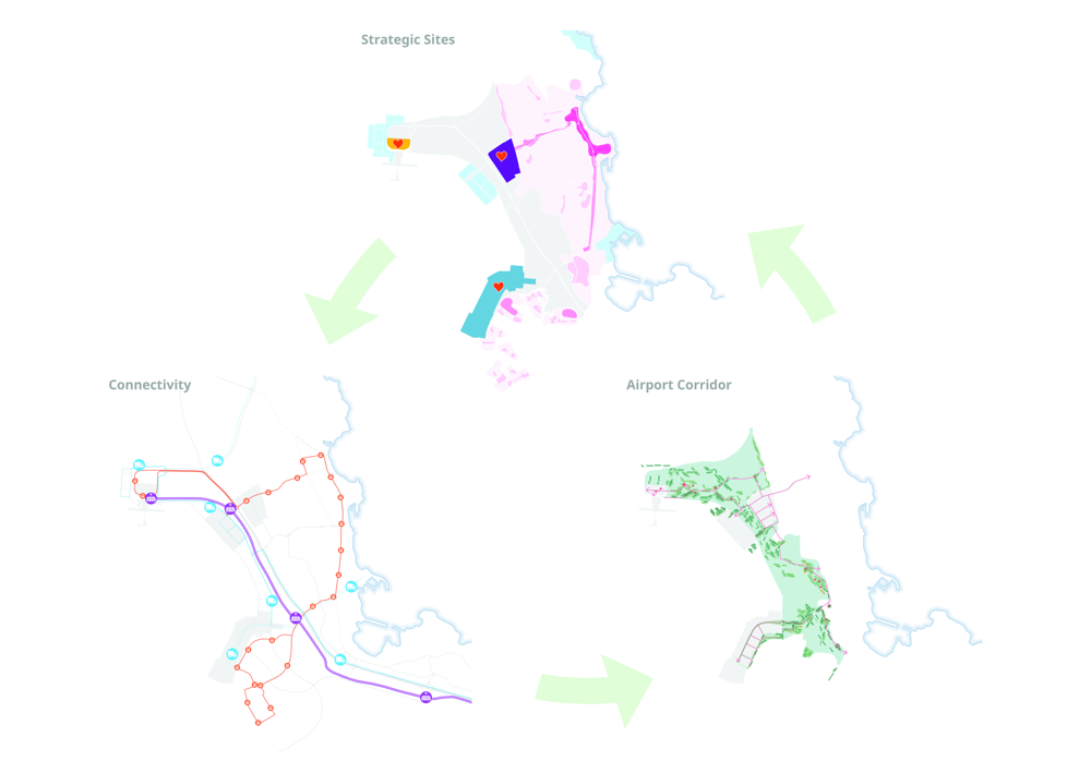 De strategie van het team concentreert zich op focusgebieden die een maximale bijdrage kunnen leveren aan identiteits- en waardecreatie. Deze locaties vormen een polycentrische stedelijke archipel en worden verbonden door het landschap van de Airport Corridor; een innovatief landschap, dat wordt ingezet om klimaat- en geluidshinder te verzachten en dat tevens een fundamentele rol speelt als 'identiteitsdrager' voor het luchthavengebied. Het landschapsconcept, dat inspeelt op het klimaatactieplan van de regering waarin herbebossing als topprioriteit wordt aangemerkt, plaatst de Airport Corridor in een nationaal netwerk van herbebossingsprojecten. Een toekomstgerichte mobiliteitsvisie, bestaand uit de Keflavík-Reykjavík Link (BRT), lokaal openbaar vervoer en actieve mobiliteitsverbindingen, verbindt de knooppunten van het luchthavengebied voor zowel reizigers, werknemers als bewoners.